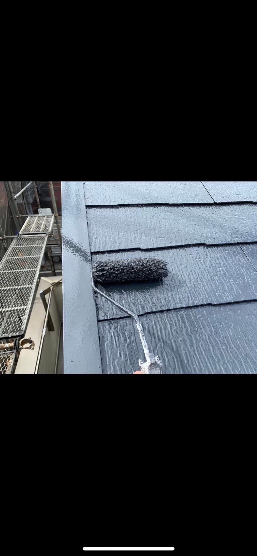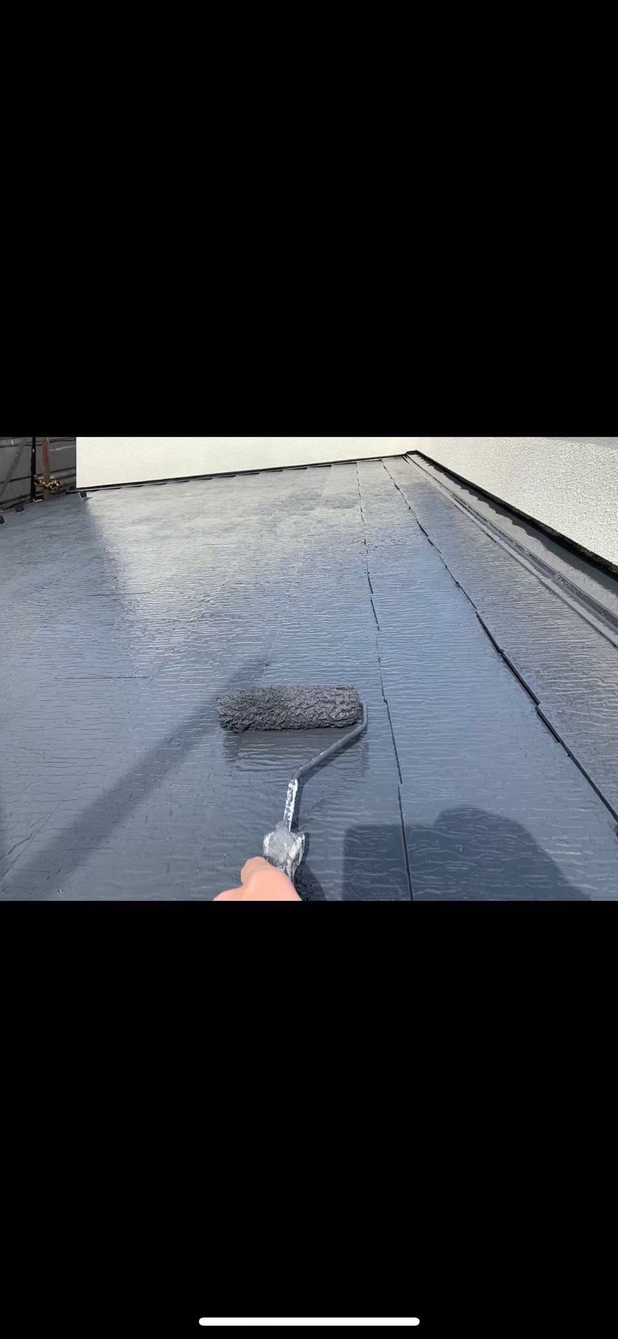 屋根材(スレート)の経年劣化による防水機能の低下があり、下塗り・中塗り・上塗りと3回塗りを行い防水機能の向上及びクラックの対策を行いました。